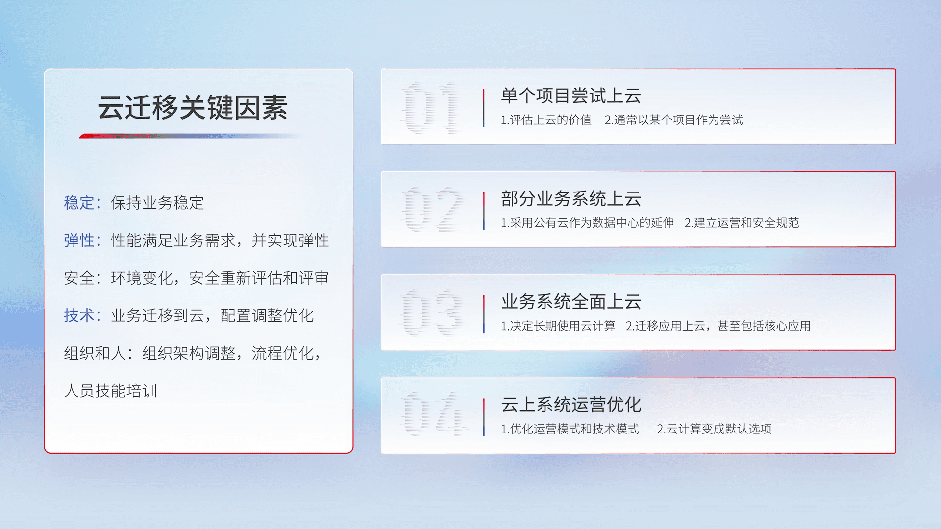 结合实际业务,,从规划设计、、、、云平台选型、、、、云原生改造、、数据迁移、、集成交付,,,迁移全过程为客户识别最佳上云路径,,,做好风险识别管理,,设计网络架构、、身份权限、、、、安全审计合规、、操作审计、、、、日志审计、、、、监控告警策略、、、多站点容灾设计等,,,,对云上基础设施进行整体规划,,,,提升IT治理水平,,以满足弹性、、、、高可用、、、高性能的需求。。。