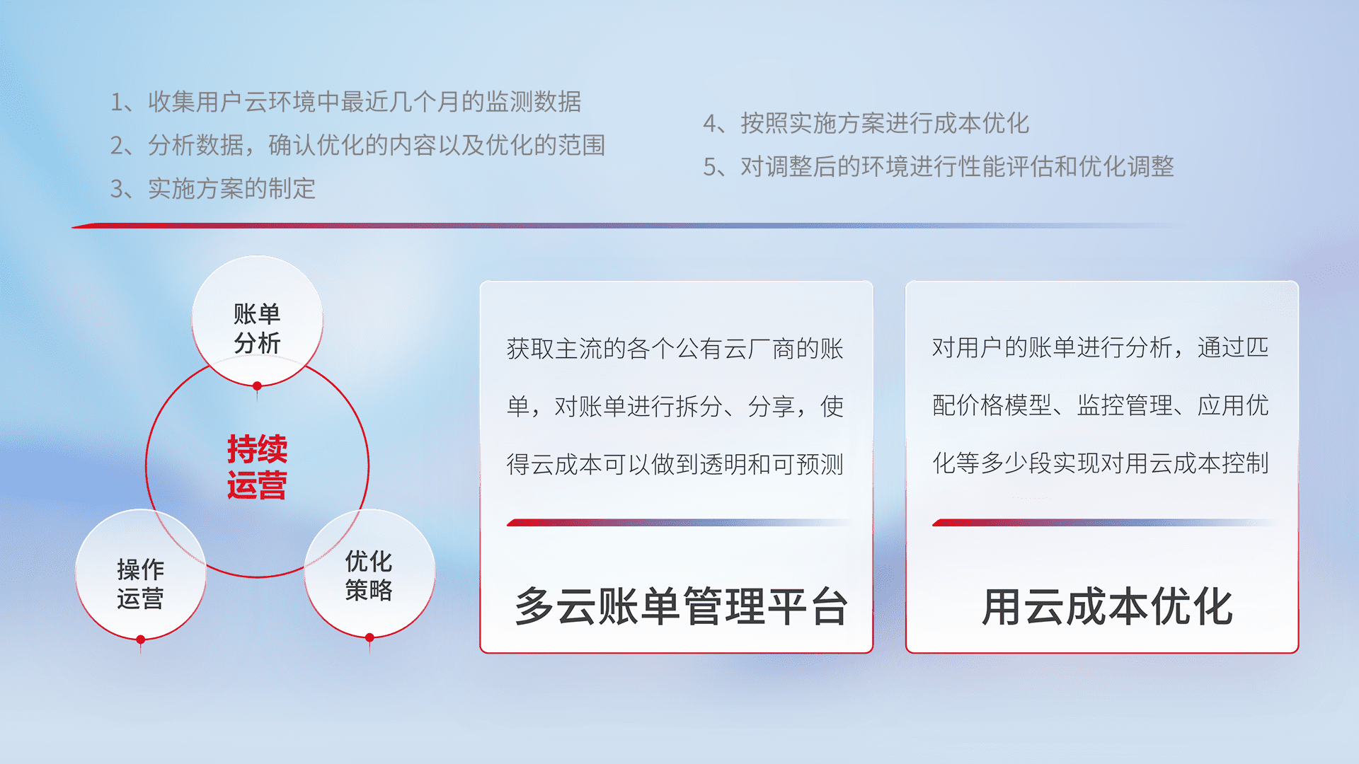通过多云纳管,,,,以统一的资源数据模型把客户的云资源进行抽象和封装,,进而实现对多云资源的统一操作,,,保障云资源管理的可靠性、、、、稳定性与可用性。。量身定制化运维内容,,,,配置、、、开发运维、、、、补丁管理、、、备份、、监控、、、认证和访问管理、、、、审计和日常巡检等,,保障在用云过程中的可靠度,,稳定度以及高可用率。。。。